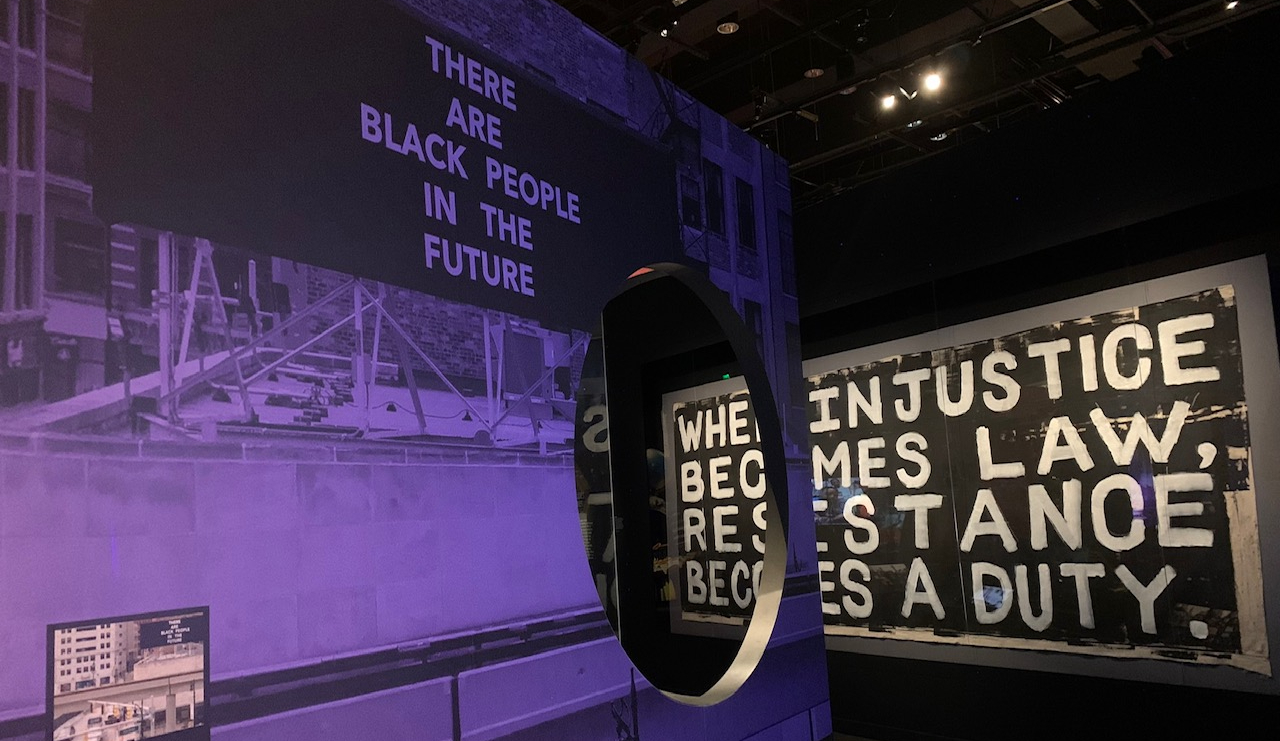The first portion of the exhibit also transports visitors into the heart of a spacecraft lifting them off into a new universe. These carefully crafted portals act as gateways ushering visitors from one era to another. Kevin explains the amount of thought and attention that went into what he calls moments in the exhibition that include visual and sensory clues to help connect themes from one section of the exhibit to another. “So if we’re talking about Luke Cage being pelted with bullets, but being impervious to it as an homage and an Afrofuturist retelling of the events of Trayvon Martin’s life and death, we wanted people to understand that as they’re reading the text label, but to also visualize it and see the next section that deals with the Black Lives Matter movement and Trayvon Martin’s life,” Kevin continues.